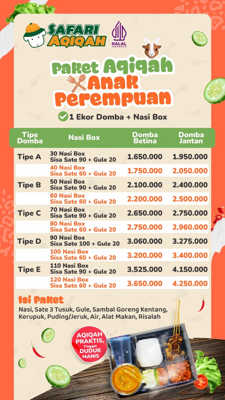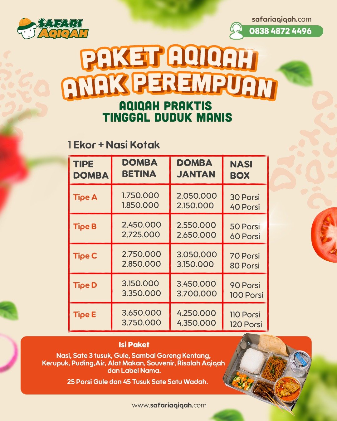 Paket anak perempuan 50 porsi dan 70 porsi Paket sudah lengkap dengan domba & nasi kotak, terdapat label nama dan dapat bonus sate 50 tusuk + gule kepala kaki disatuwadahkan serta banyak bonus souvenir yang bisa ayah bunda dapatkan.