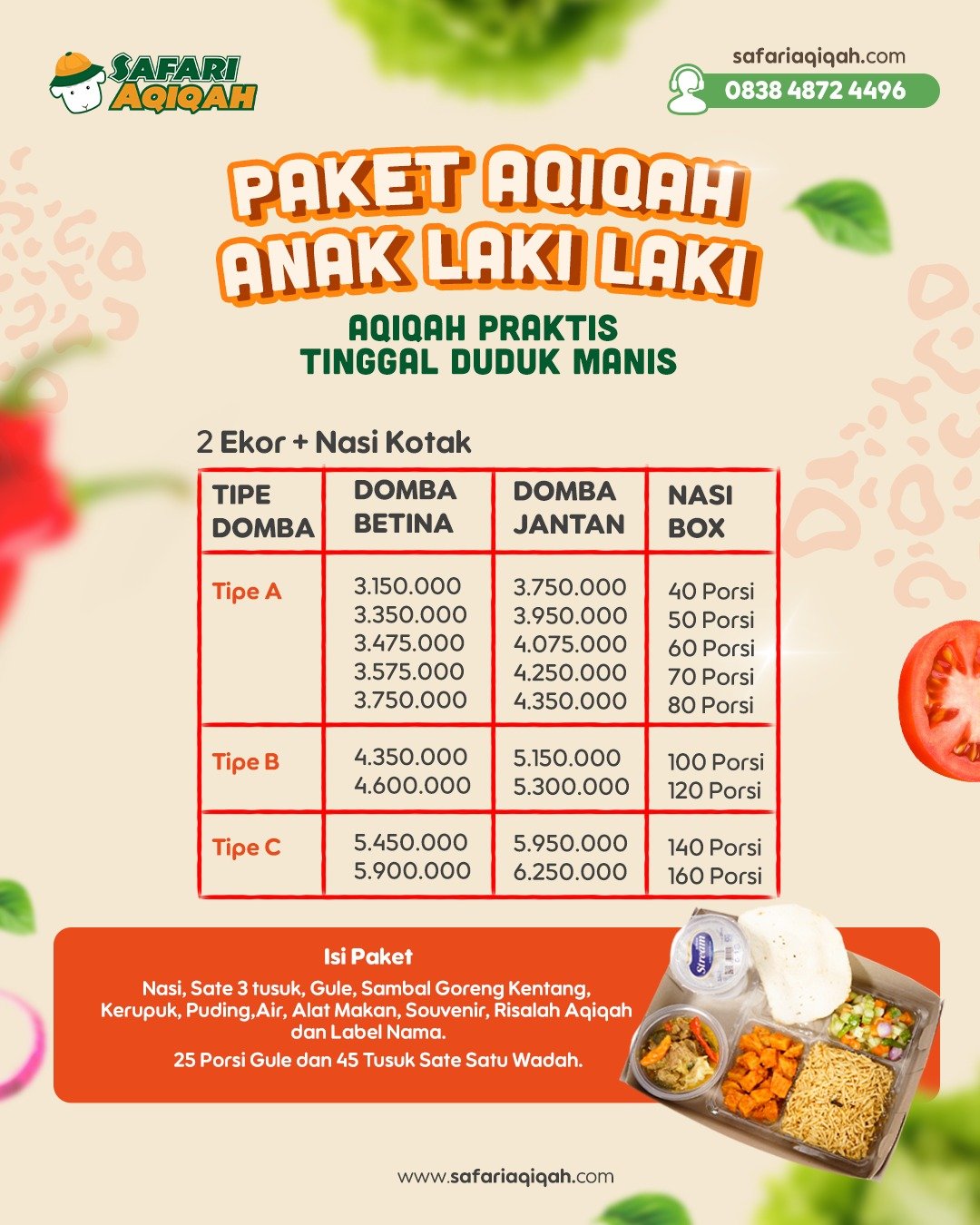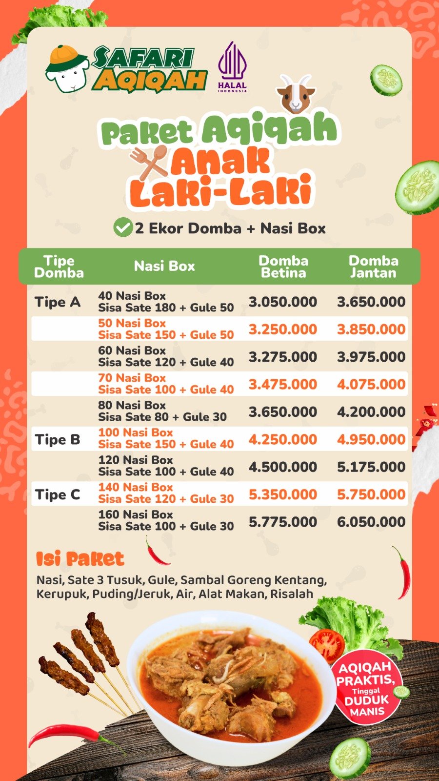 Paket anak laki laki 2 ekor domba dan nasi kotak lengkap 80 porsi dan 120 porsi lengkap dengan label nama, dapat bonus sate 50 tusuk + gule kepala kaki disatuwadahkan serta banyak bonus souvenir yang bisa ayah bunda dapatkan.